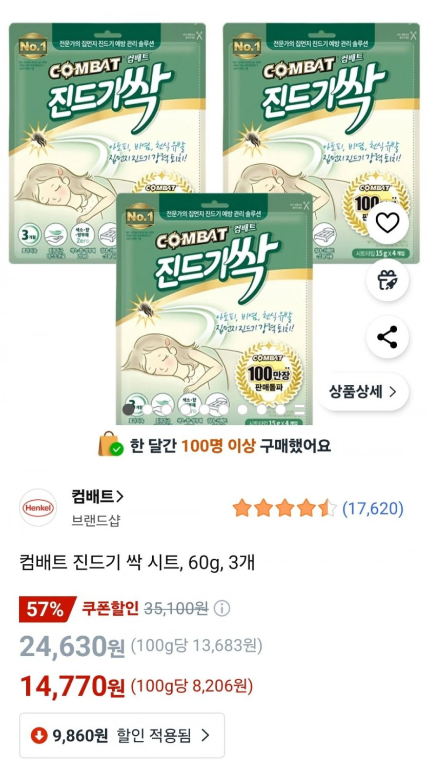 [쿠팡]컴배트 진드기 싹 시트 60g 3개입*3개 (14,770원/무료) 작성자 정보 몽이 작성 작성일 2025.07.17 18:09 컨텐츠 정보 75 조회 목록 본문 구매링크는 제휴 링크로 전환될 수 있으며, 이를 통해 제휴사로부터 일정비율의 커미션을 지급받습니다. 3개입*3세트로 총 9개네요침대 매트리스에 붙이면 집먼지 진드기 걱정 없어요 https://www.coupang.com/vp/products/7136754195?itemId=18368177739&vendorItemId=85191199612&pickType=COU_PICK&q=7136754195 - 18368177739&searchId=0af8c2f0342139&sourceType=search&itemsCount=9 관련자료 이전 [쿠팡]컴배트 진드기 싹 시트 60g 3개입*3개 (14,770원/무료) 작성일 2025.07.17 18:09 다음 [헬로모바일]7GB +1mbps / 통화 문자 무제한 + 매월 상품권 (6개월간 월 -13000원/0원) 작성일 2025.07.17 18:09 댓글 0 등록된 댓글이 없습니다. 로그인한 회원만 댓글 등록이 가능합니다. 목록
