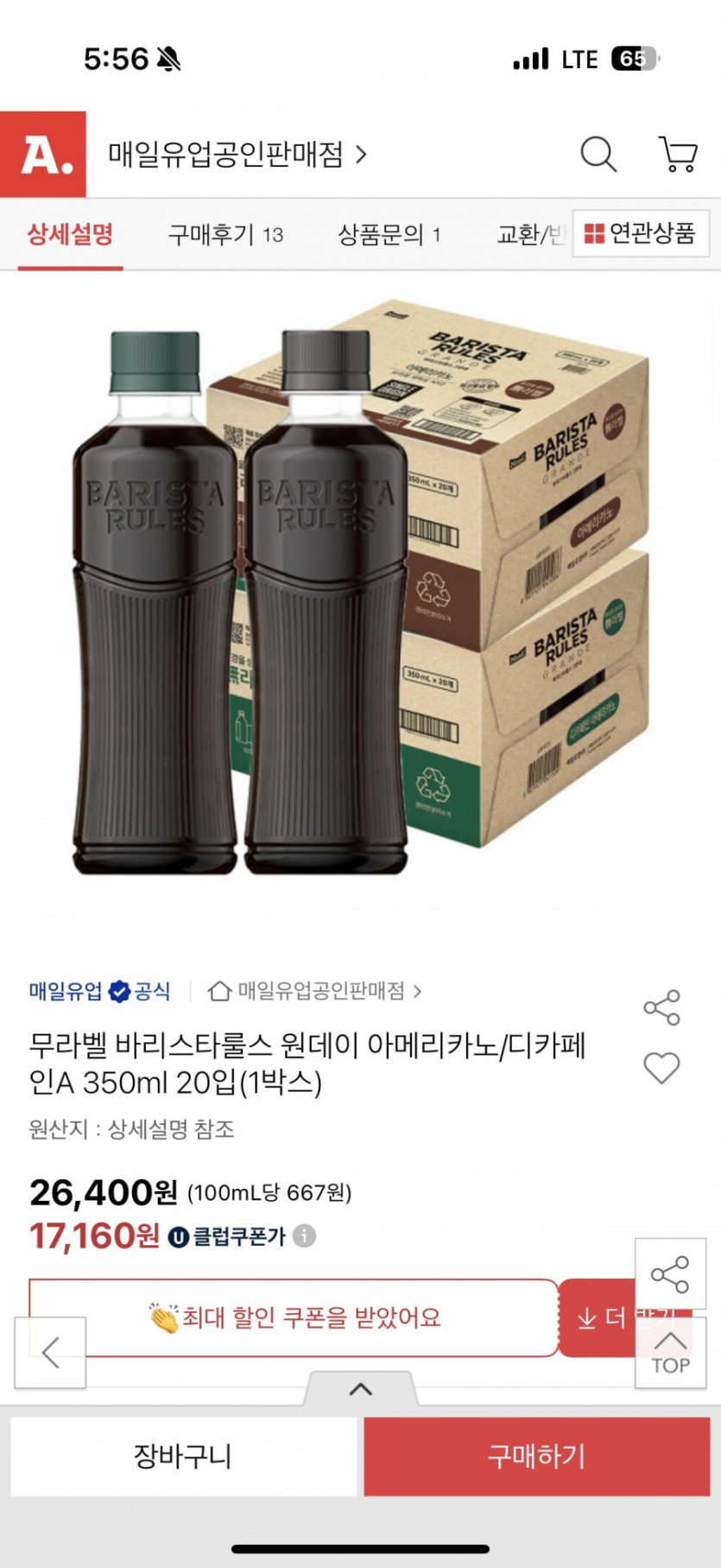 [옥션]바리스타룰스 무라벨 커피 아메리카노/디카페인 350ml 20입 (15,950원/무료)