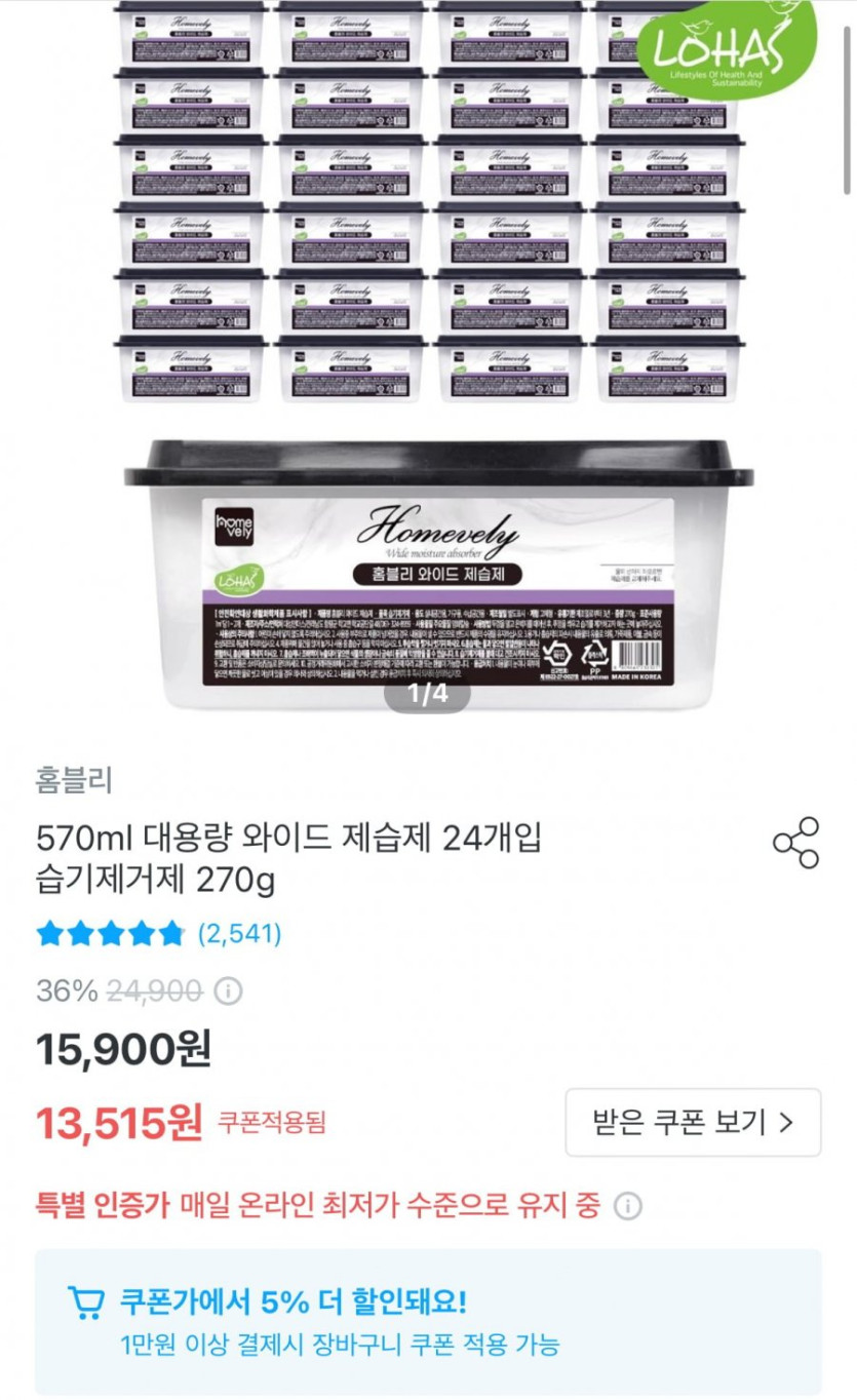 [오늘의집]홈블리 570ml 와이드 대용량 제습제 24개 (12,840원/무료배송)