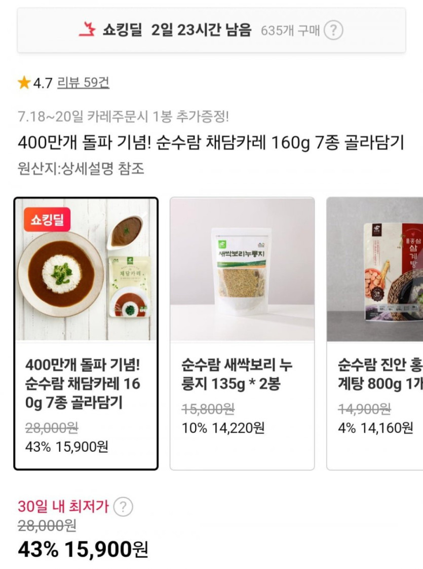 [11번가]채담카레 160g 7종 골라담기 (15,900원/무료)