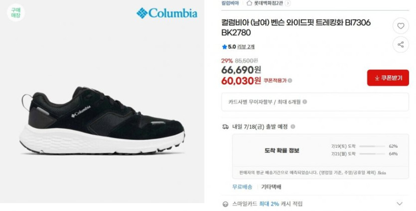 [롯데ON]컬롬비아 남/여 벤슨 와이드핏 트레킹화 58,800원/무료