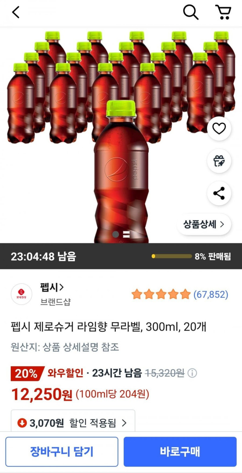 [쿠팡]펩시 제로슈거 라임향 무라벨 300ml 20개(와우 12,250원/무배) 작성자 정보 구름 작성 작성일 2025.07.18 07:55 컨텐츠 정보 31 조회 목록 본문 구매링크는 제휴 링크로 전환될 수 있으며, 이를 통해 제휴사로부터 일정비율의 커미션을 지급받습니다. 펩시 제로 무라벨입니다 필요하신분 보세요 https://link.coupang.com/a/cFsmbO 관련자료 이전 [G마켓]에프킬라 킨 500ml x 4개 모기약 10%적립 유클 체감가 (9,810원/무료) 작성일 2025.07.18 08:05 다음 [롯데온]탑텐 남성 쿨링쇼츠 (13,410원 / 무배) 작성일 2025.07.18 07:55 댓글 0 등록된 댓글이 없습니다. 로그인한 회원만 댓글 등록이 가능합니다. 목록