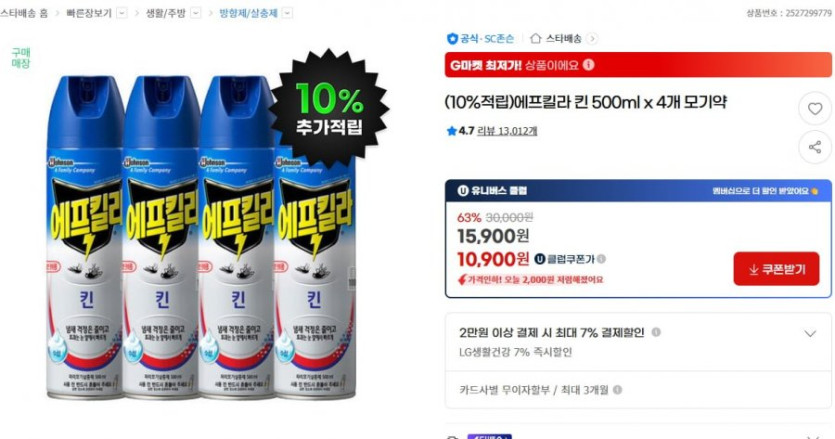 [G마켓]에프킬라 킨 500ml x 4개 모기약 10%적립 유클 체감가 (9,810원/무료)