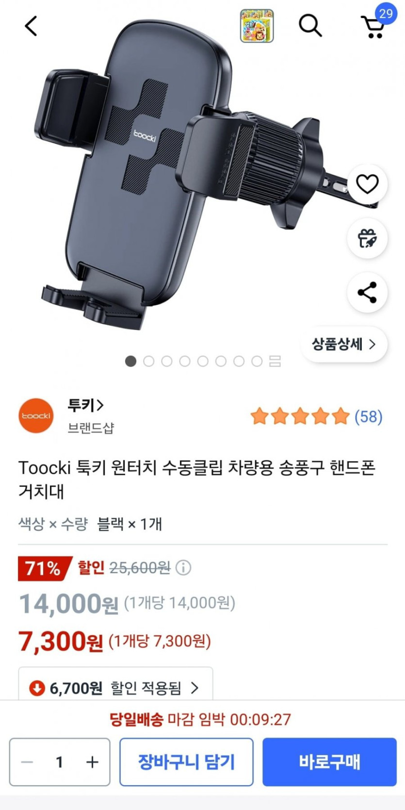 [쿠팡]Toocki 툭키 원터치 수동클립 차량용 송풍구 핸드폰 거치대(7,300원/판매자로켓)