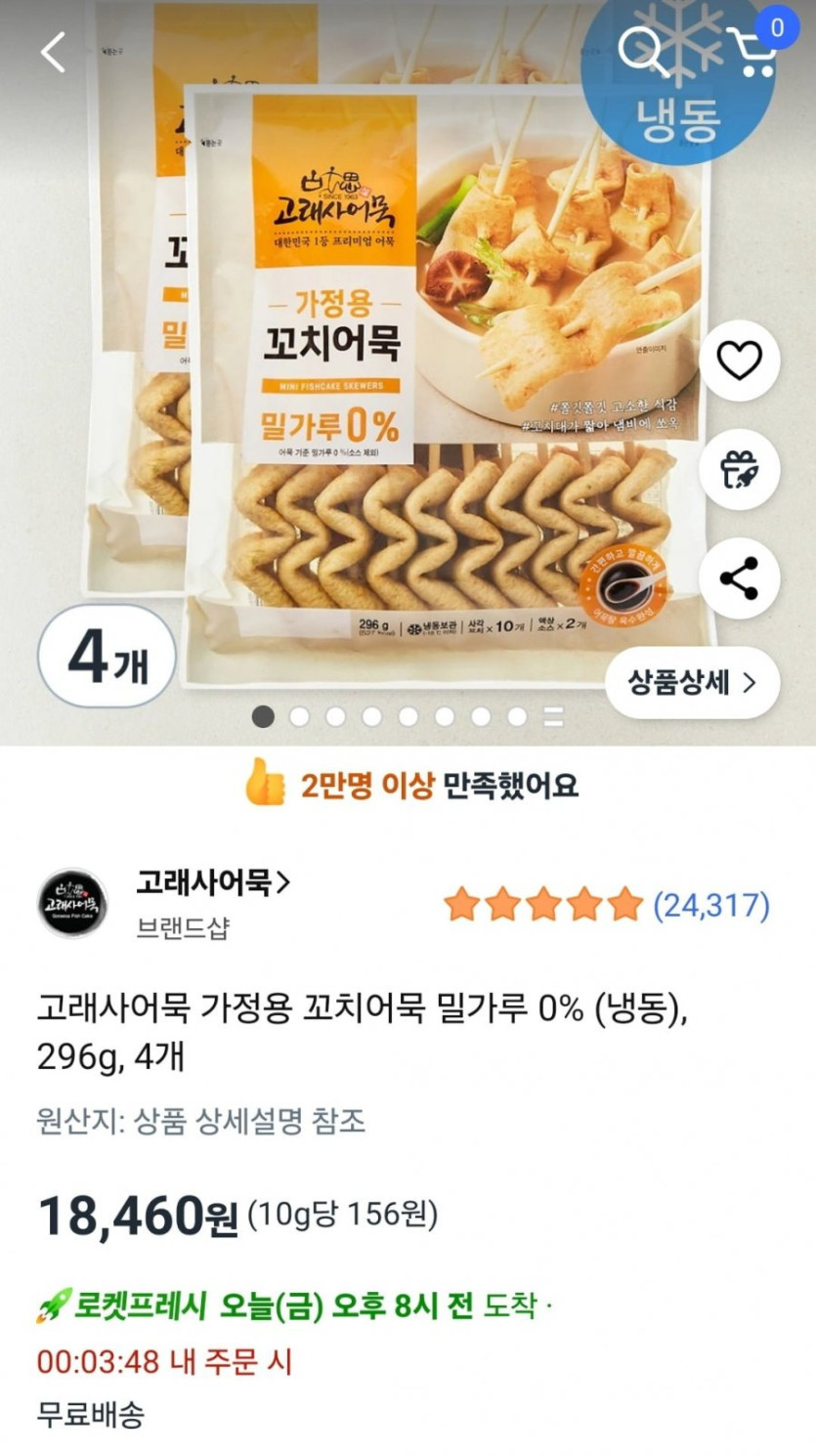 [쿠팡프레시]고래사어묵 꼬치어묵 밀가루 0% 296g 4개 (18,460원/무배)