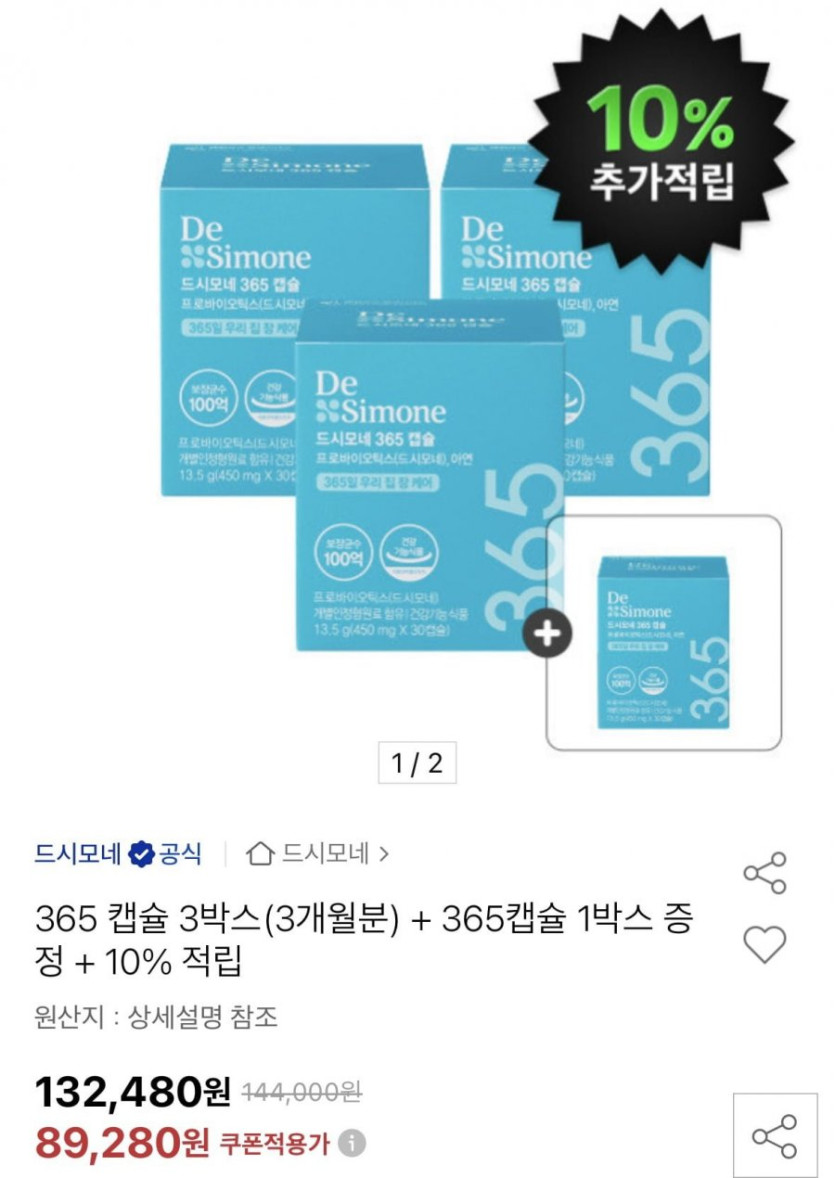 [옥션]드시모네 365캡슐3박스+1박스 증정 (89,280원/무료배송)