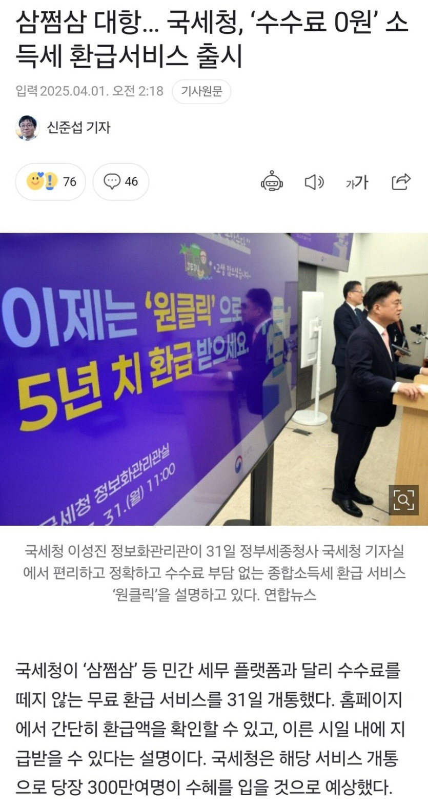 국세청, 삼쩜삼 저격용 무료 환급 서비스 출시 작성자 정보 헐 작성 작성일 2025.04.01 19:47 컨텐츠 정보 443 조회 목록 본문 홈택스(손택스)에 들어가서'종합소득세 원클릭 환급신고' 누르면 됨 관련자료 이전 요즘 지브리 때문에 힘들다는 챗GPT 근황.jpg 작성일 2025.04.02 10:12 다음 아우디 코리아 만우절 SNS.jpg 작성일 2025.04.01 17:46 댓글 0 등록된 댓글이 없습니다. 로그인한 회원만 댓글 등록이 가능합니다. 목록