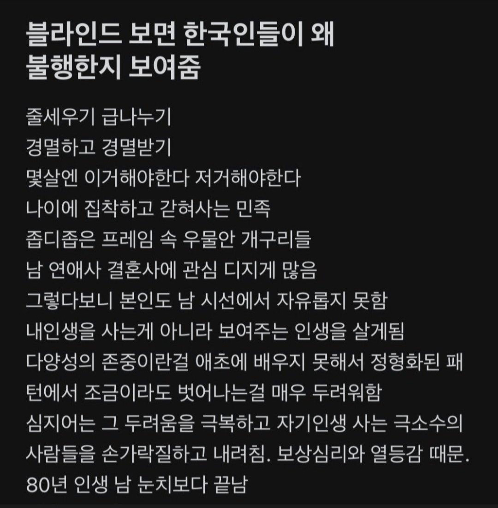 블라인드 보면 한국인들이 왜 불행한지 보여줌.JPG 작성자 정보 헐 작성 작성일 2025.04.05 19:51 컨텐츠 정보 496 조회 목록 본문 관련자료 이전 나혼산) 세상 얌전한 바이크가게 고양이 작성일 2025.04.05 19:52 다음 지진으로 붕괴된 태국 빌딩 근황 작성일 2025.04.05 19:47 댓글 0 등록된 댓글이 없습니다. 로그인한 회원만 댓글 등록이 가능합니다. 목록