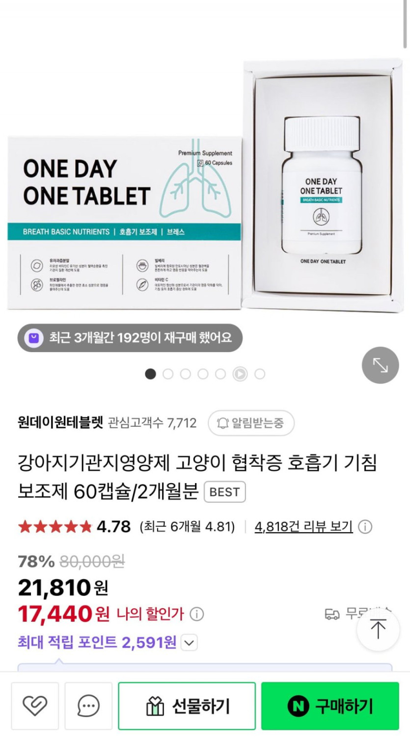 [네이버]강아지/고양이 호흡기&기관지 영양제 (17,440/무료)