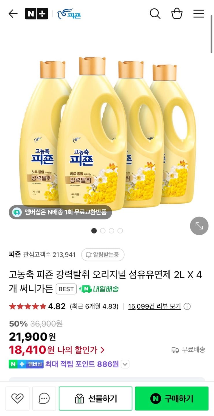 [네이버]고농축 섬유유연제 써니가든 2L 4개 (18,410원/무료)