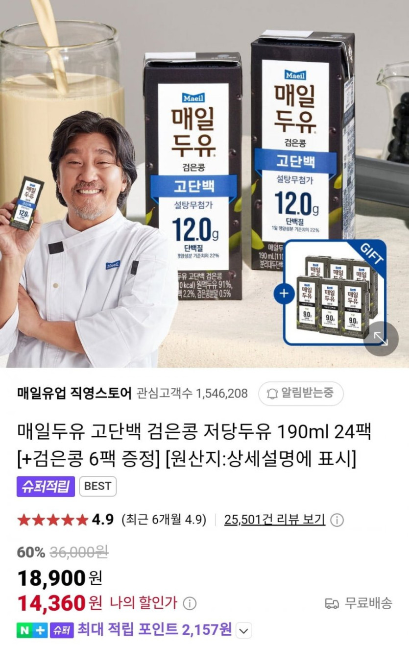 [네이버]매일두유 고단백 검은콩 저당우유 190ml 24팩 + 검은콩 두유 6팩 (14,360원/무료)