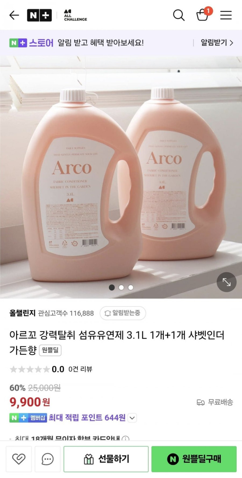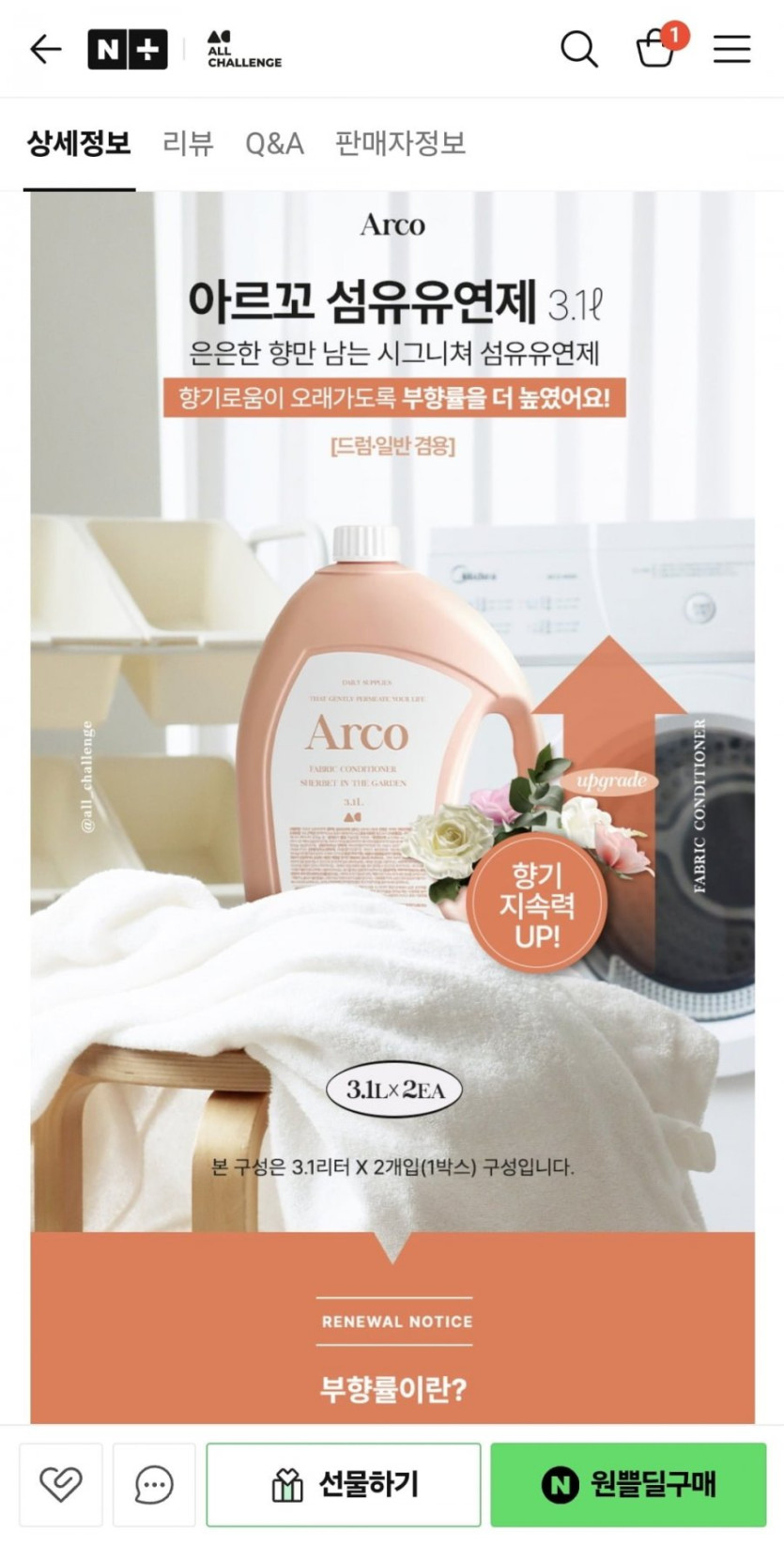 [네이버]아르꼬 강력탈취 섬유유연제 3.1L 1+1 (9,900원/무료)