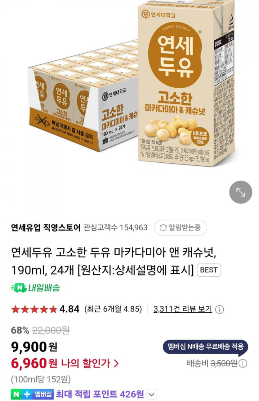 [네이버]연세두유 고소한 두유 마카다미아 앤 캐슈넛, 190ml, 24개(6,960원/멤버십무배) 작성자 정보 솜이 작성 작성일 2025.05.14 01:17 컨텐츠 정보 49 조회 목록 본문 배송비 네이버멥버십무료 개당 290원 할인됩니다https://brand.naver.com/yonseidairy/products/9121345990https://brand.naver.com/yonseidairy/products/9121345990 관련자료 링크 https://brand.naver.com/yonseidairy/products/9121345990 5 회 연결 http://뽐뿌 8 회 연결 이전 (쿠팡)청정원 순살바삭치킨 550g 9,980원(프레시) 작성일 2025.05.13 21:27 다음 [롯데온]아빠식당 국내산 황기 닭곰탕 600g 1팩 (3,900원/무배) 작성일 2025.05.14 01:01 댓글 0 등록된 댓글이 없습니다. 로그인한 회원만 댓글 등록이 가능합니다. 목록