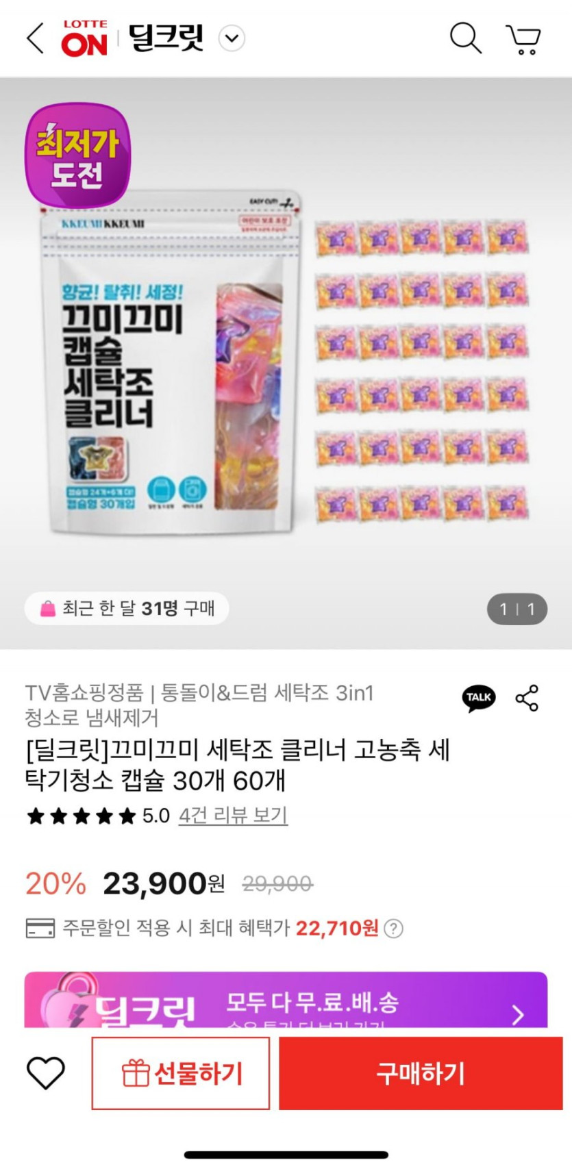 [롯데온]끄미끄미 고농축 세탁조 클리너 30개(22,710원/무배)