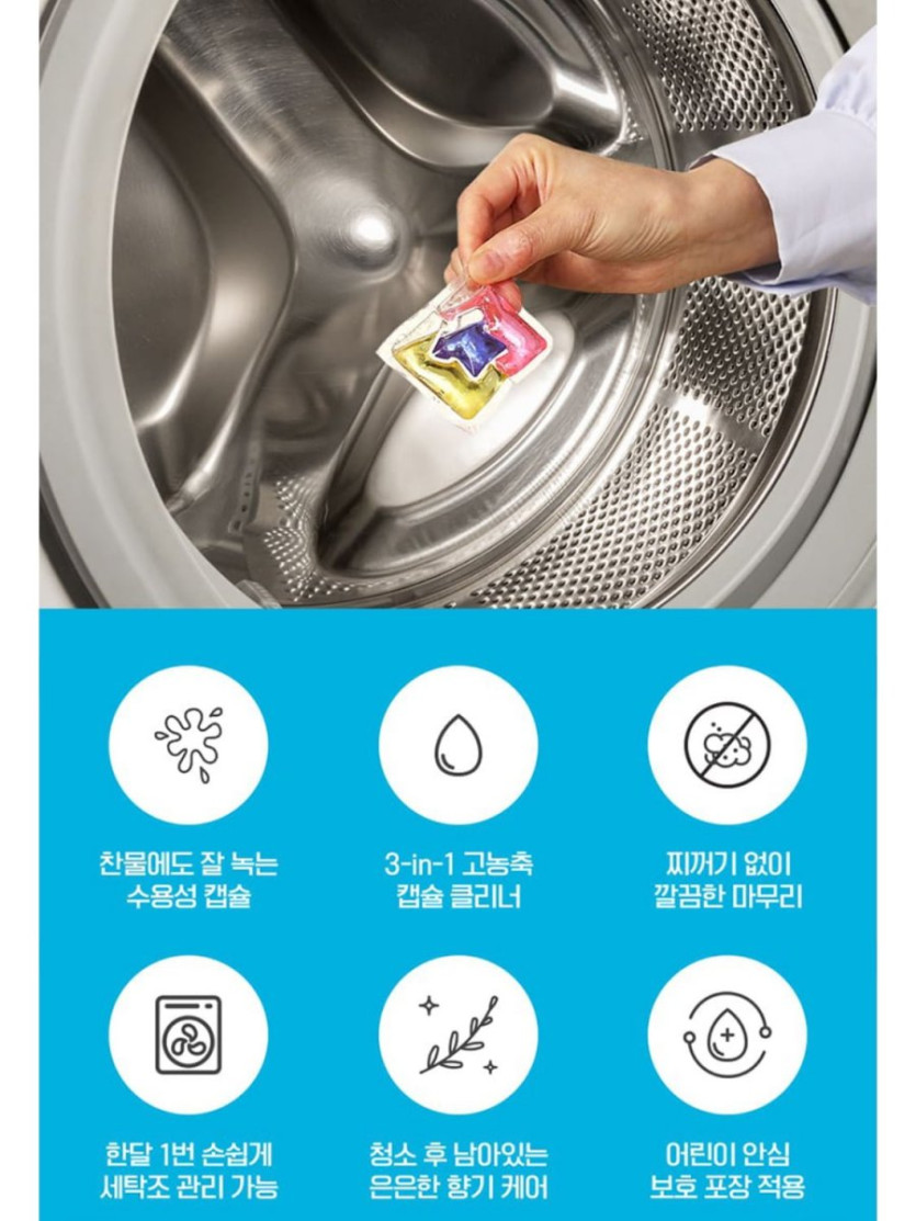 찬물에 잘 녹고 일반 드럼세탁기 둘다 사용가능하고 한캡슐씩 넣고 돌려주면 되요