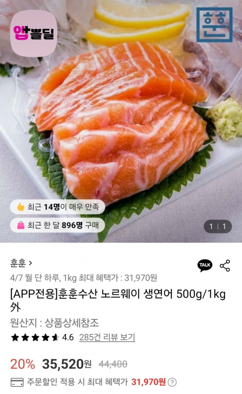 [롯데온]노르웨이 생연어 1kg (국민 31,970원 / 무료)