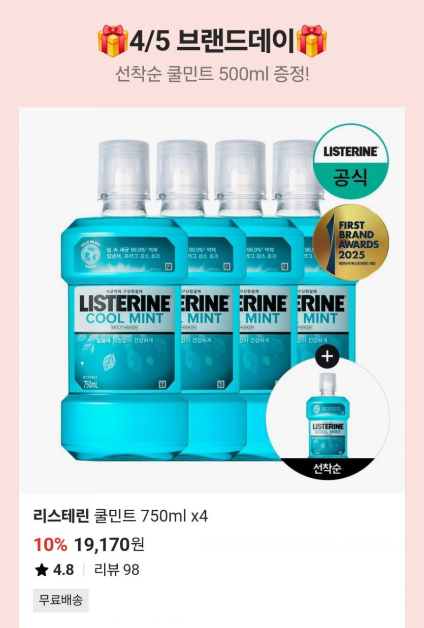 [롯데온]리스테린 쿨민트/쿨마일드/그린티 750mlx4+500ml(17,830원/무배)