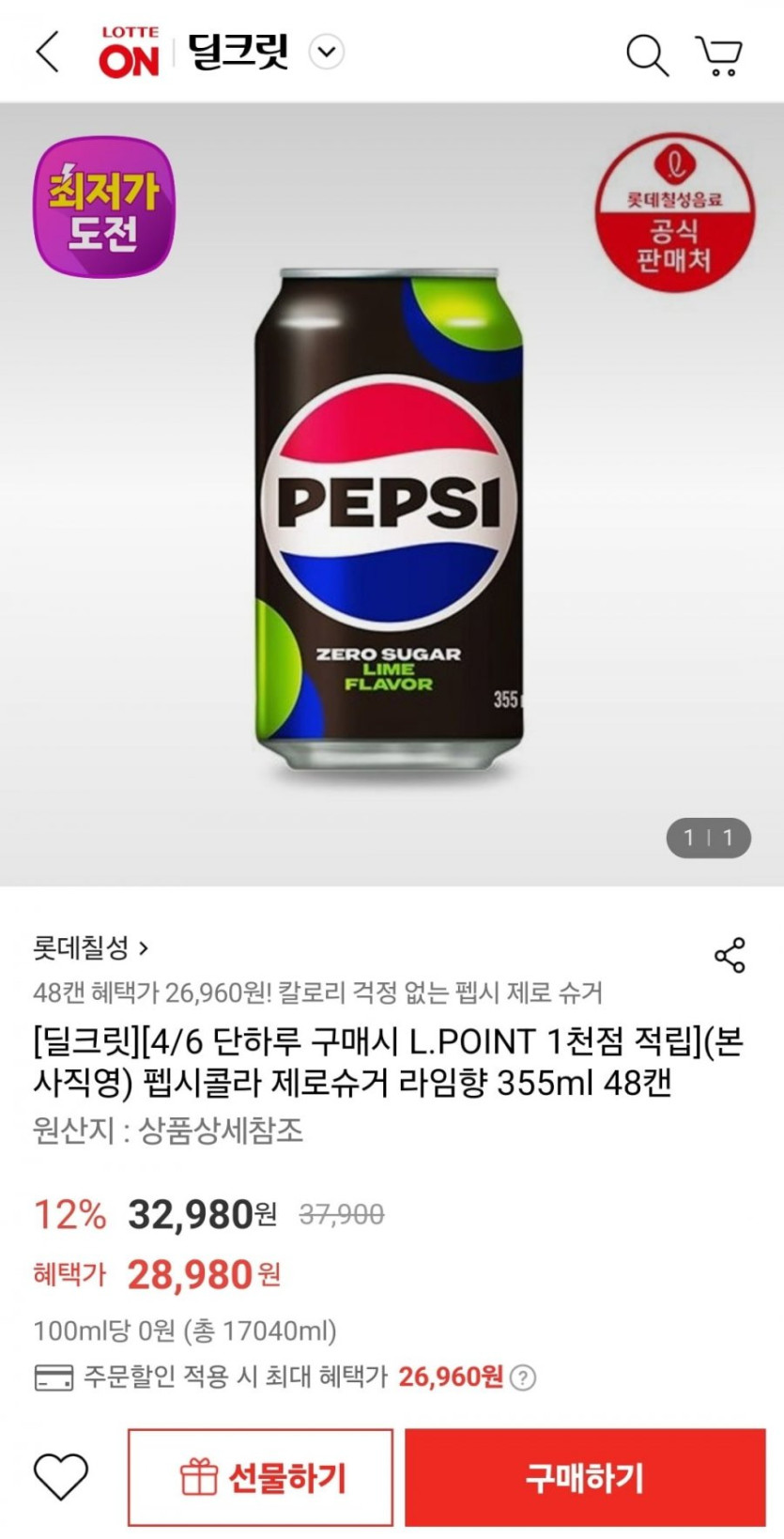 [롯데온]펩시 제로슈가 라임 355ML 48캔 (26,960원/무료)