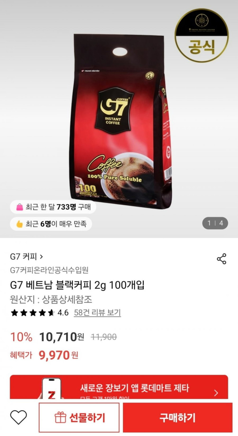 [롯데온]G7 블랙커피 100개입 (9,970원/무배)