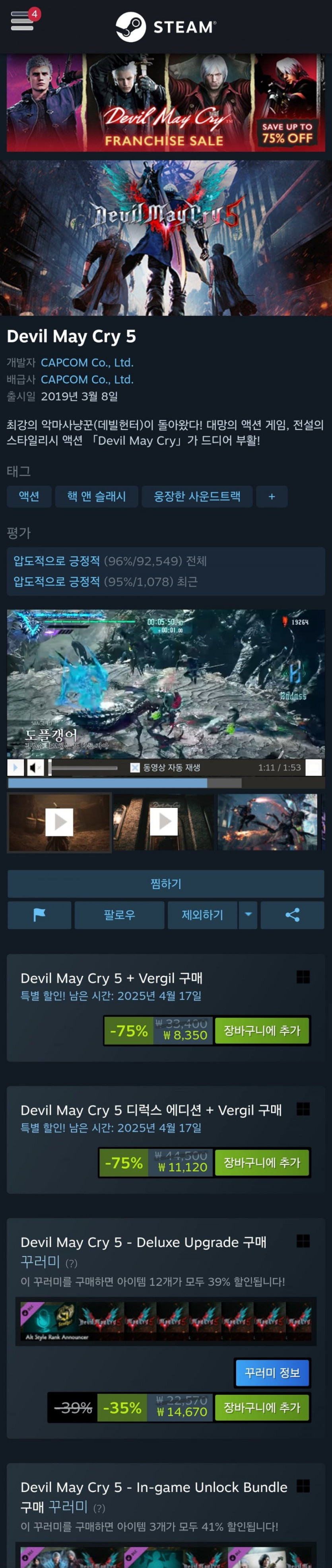 [스팀](역대가) 데빌메이크라이5 + 버질 에디션 (8,350원/무료)