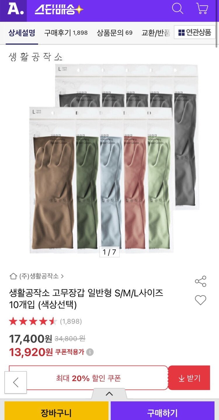 [옥션]생활공작소 고무장갑 일반형 S/M/L 10개입 (13,920원/무료)