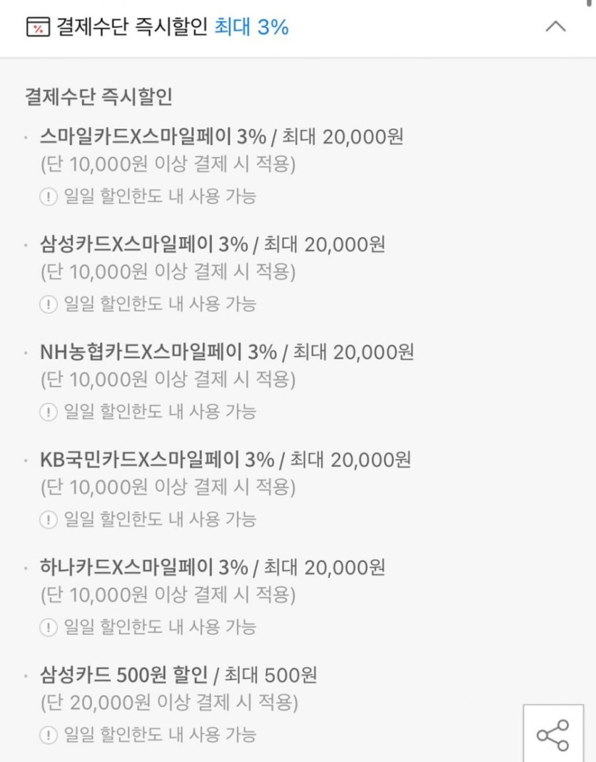 삼성/농협/국민/하나/스카 결제시 3% 추가할인 있네요.
