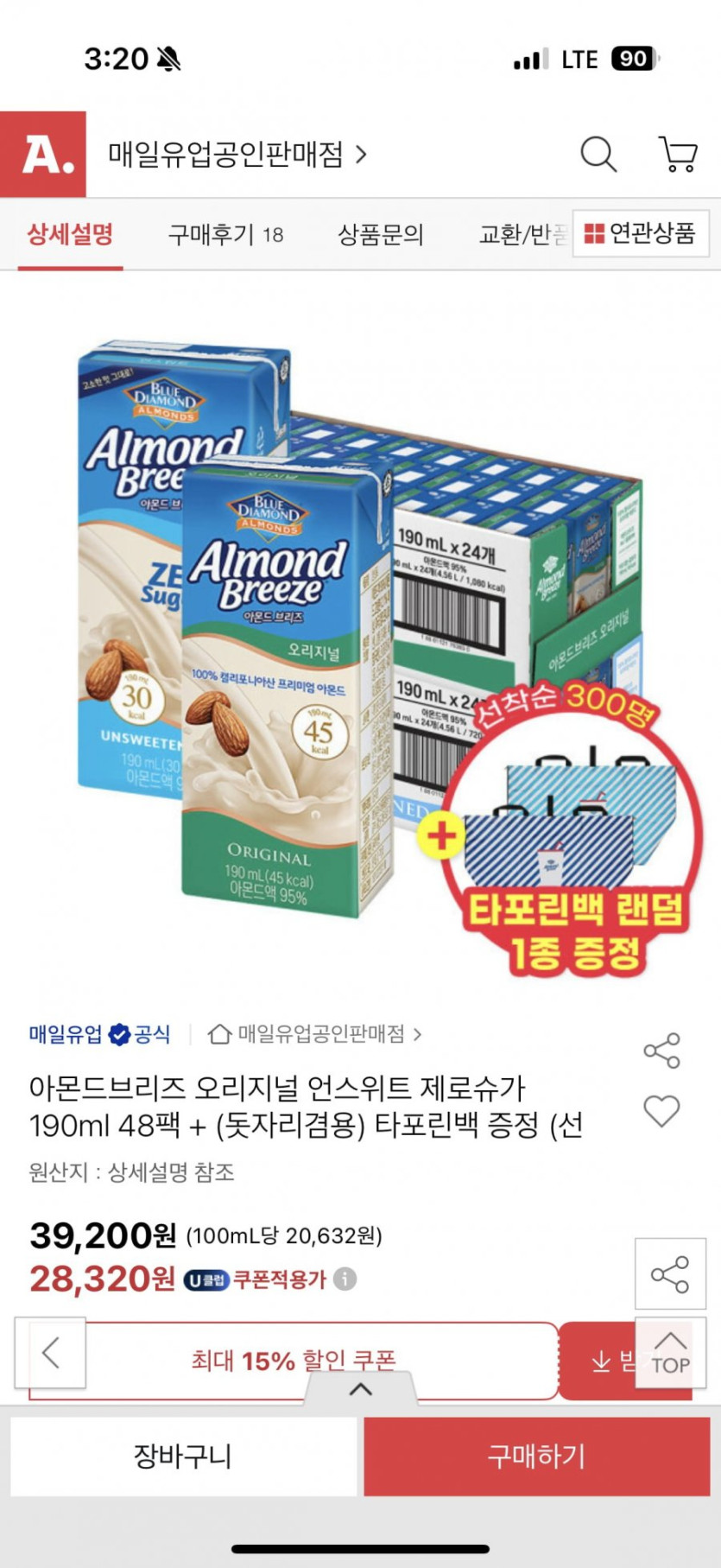 [옥션]아몬드브리즈 오리지널/언스위트 190ml 48팩 + (돗자리겸용) 타포린백 증정 (유클 26,900원/무료)