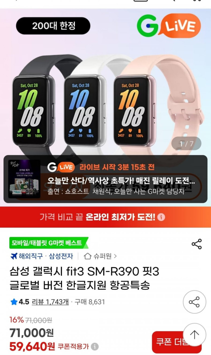 (지마켓)삼성 갤럭시FIT3 SM-R390 핏3 한글지원 해외배송 (59,640원/무료)