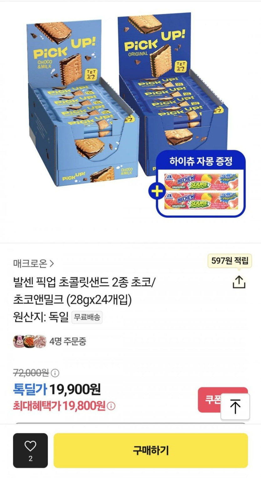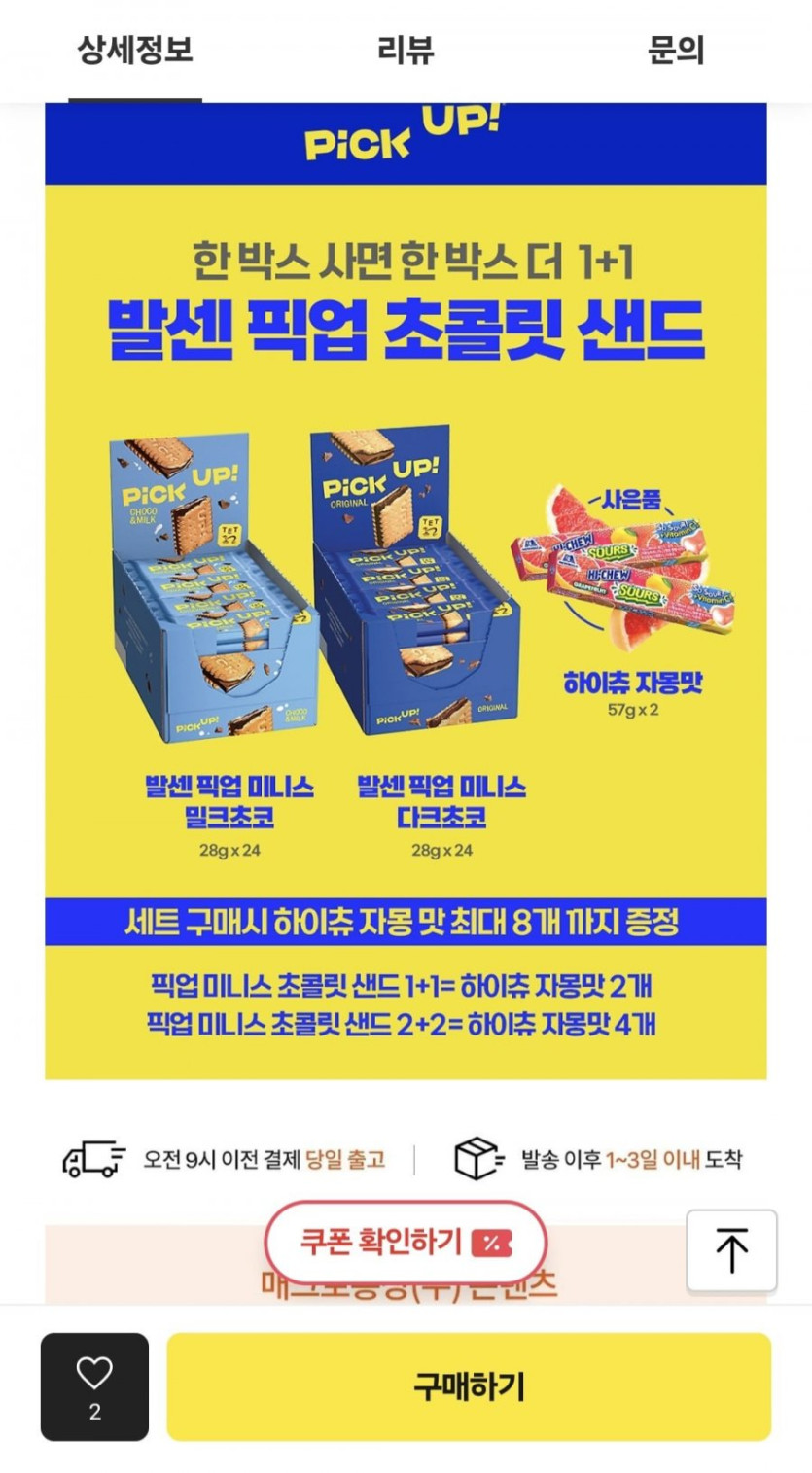 [카카오]발센 픽업 초콜릿샌드 2종 초코/초코앤밀크 48통 (19,900원/무료)