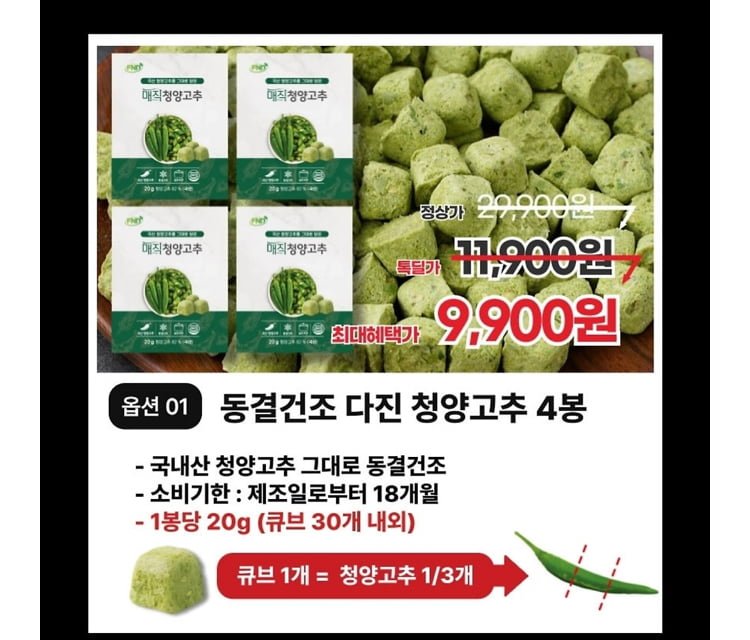 전부 국내산 100%에 큐브형 동결건조방식인데 보관, 사용 편하고 동결건조 제조라서 맛도 원물이랑 적게 차이날듯합니다