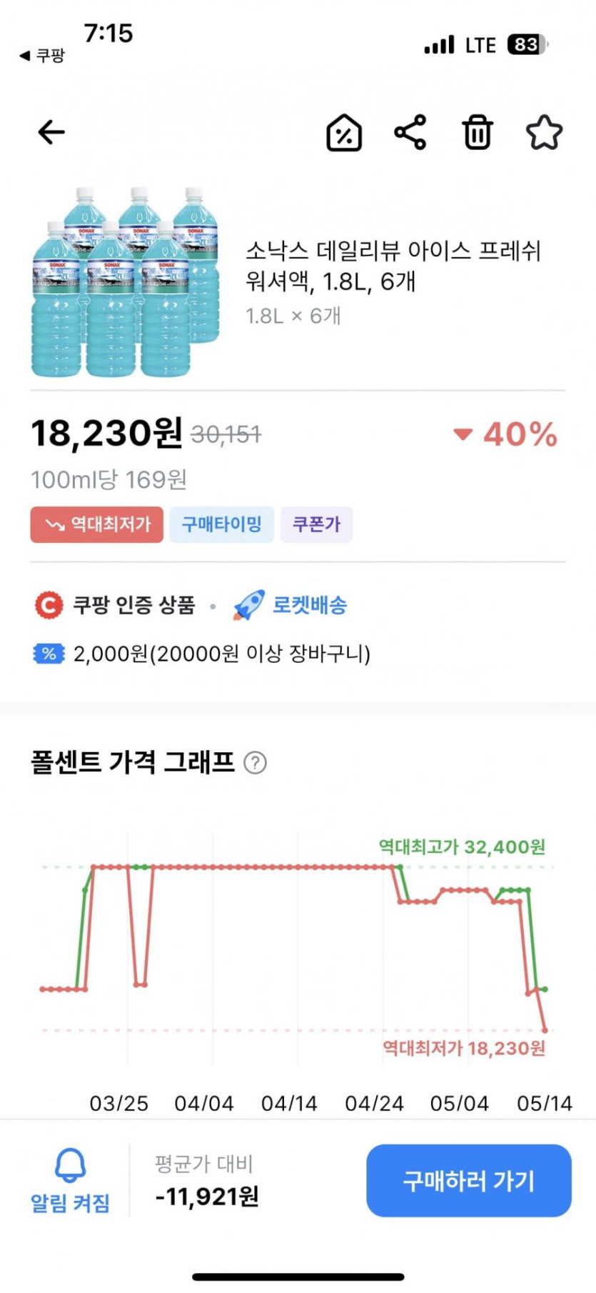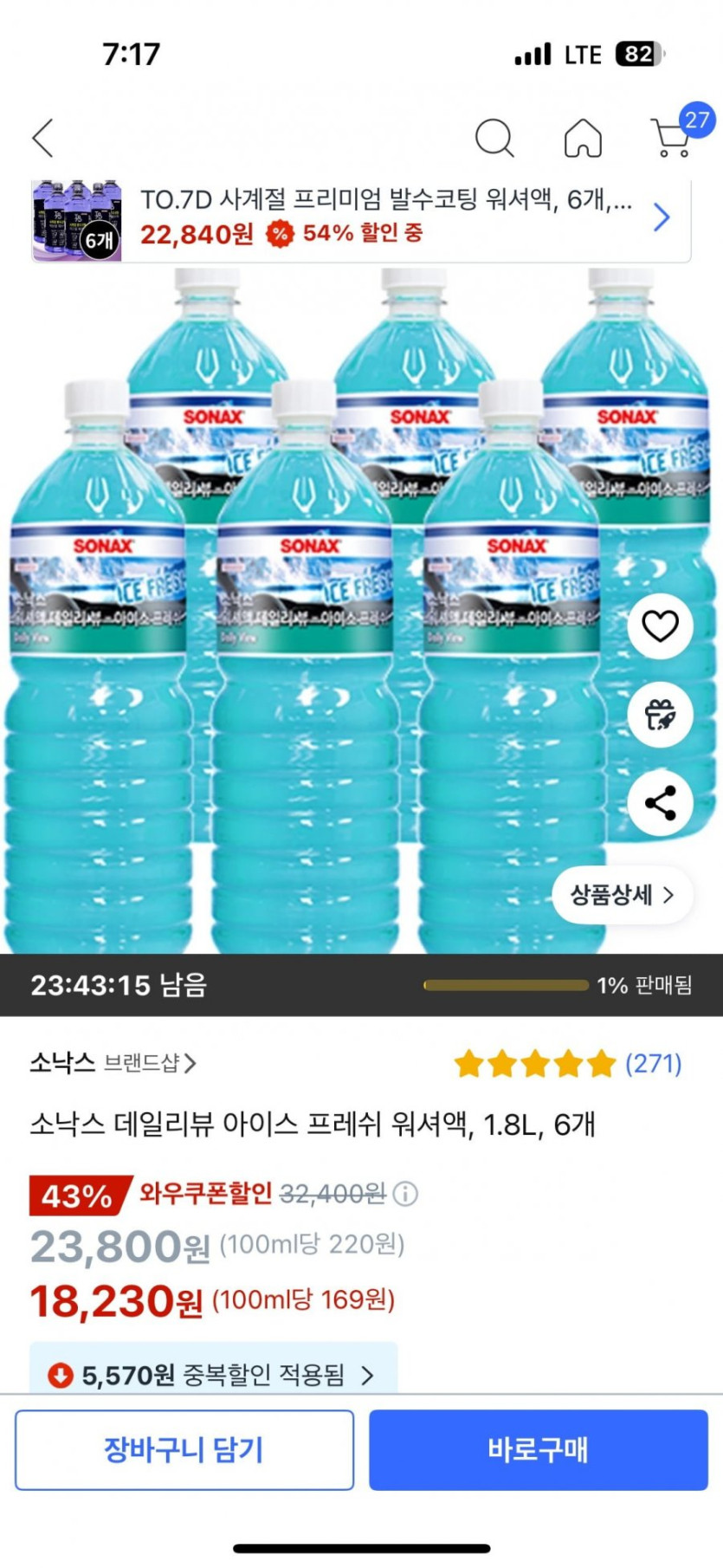 [쿠팡]소낙스 데일리뷰 워셔액 1.8L x6개(18,230원/와우무료) 작성자 정보 구름 작성 작성일 2025.05.14 07:21 컨텐츠 정보 87 조회 목록 본문 구매링크는 제휴 링크로 전환될 수 있으며, 이를 통해 제휴사로부터 일정비율의 커미션을 지급받습니다. 소낙스 워셔액입니다워셔액은 소낙스꺼만 사용중인데 잘닦이고 좋아요구입차도 경고등 안뜬다고 합니다 https://link.coupang.com/a/ctFITt 관련자료 이전 [취미용품] [매니아 하우스] 5월 피규어 랜덤박스 (15만원) 작성일 2025.05.14 07:38 다음 [옥션]2+1 산타바바라 폴로 숄더백 가방/벨트/모자 모음전 (8,960원 / 무배) 작성일 2025.05.14 07:10 댓글 0 등록된 댓글이 없습니다. 로그인한 회원만 댓글 등록이 가능합니다. 목록