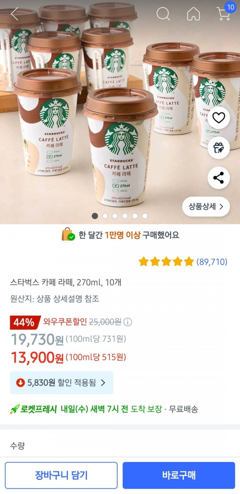 [쿠팡]스타벅스 카페라떼 270ml, 10개(13,900원/로켓프레시 15,000원이상 와우무료)