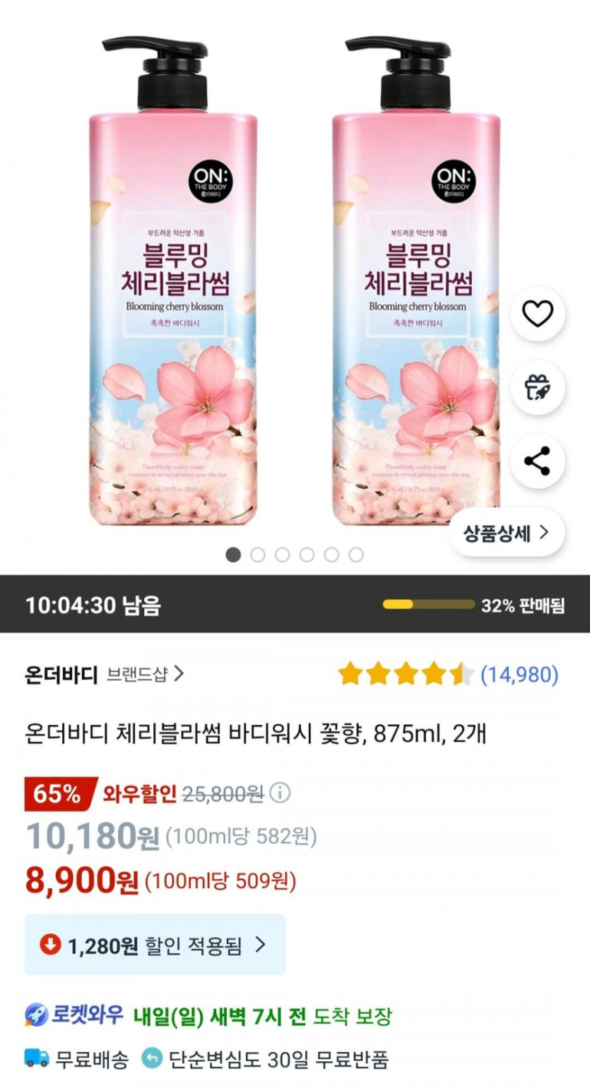온더바디 체리블라썸 바디워시 875ml 대용량으로 2개 8,400원에 떴는데 가격 괜찮네요