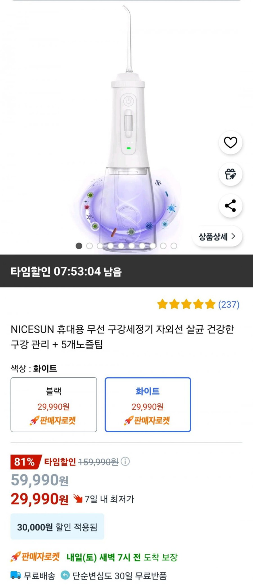 1년 무상 A/S 가능하고 무선 구강세정기에 5개노즐팁까지 포함해서 29,990원 나옵니다