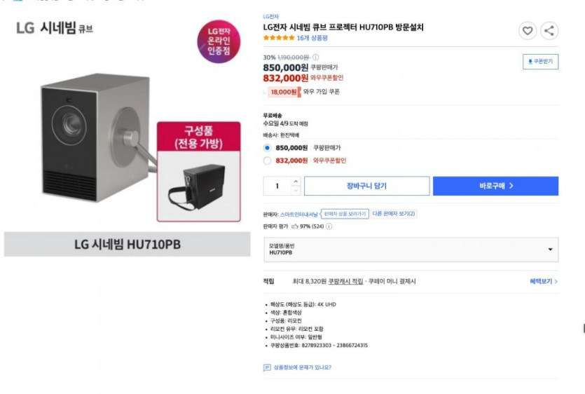 [쿠팡]LG전자 시네빔 큐브 프로젝터 HU710PB 방문설치 (850,000원/무료배송)