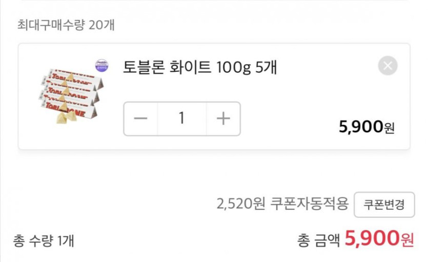 [11번가]기한임박 토블론 화이트 100g 5개 (5,900원/무료)