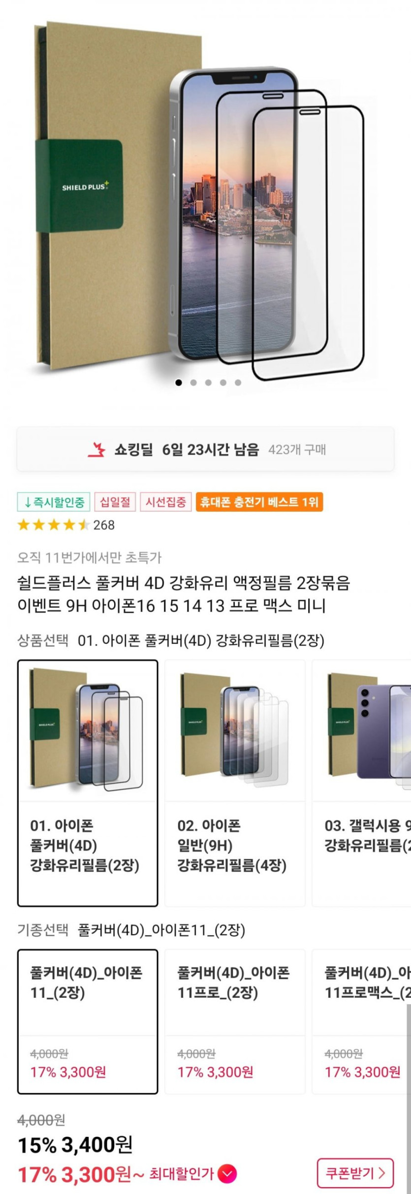 [11번가]아이폰 풀커버 4D 강화유리필름 2장 외 (3,400원/무료)