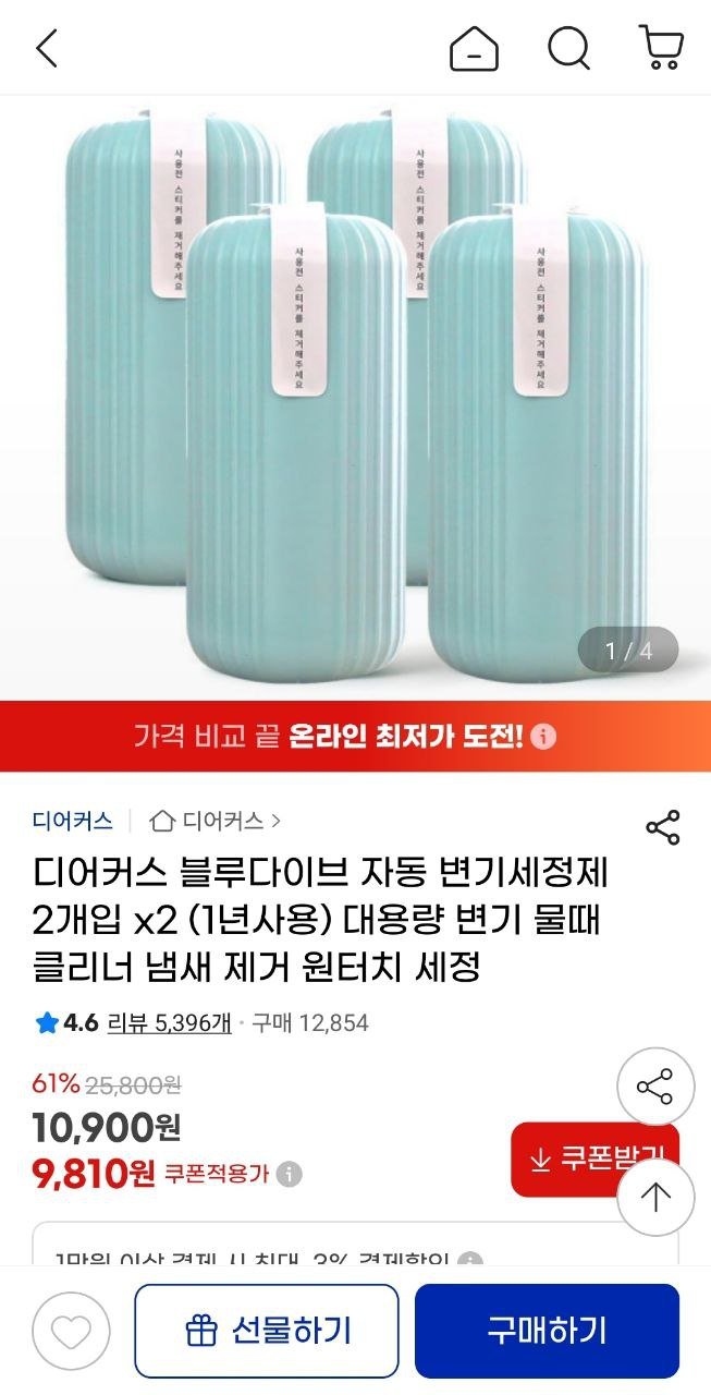 [G마켓]블루다이브 자동변기세정제 2+2 (1년사용) (9,810원/무료배송)