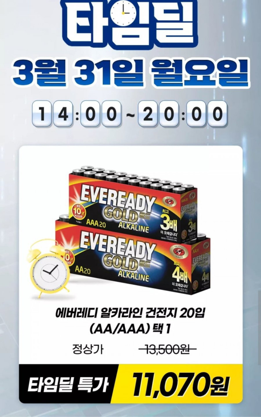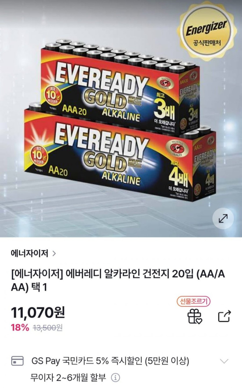 [GS샵]에너자이저 에버레디 알카라인 건전지 20입(AA/AAA) 택1 (11,070원/무료)