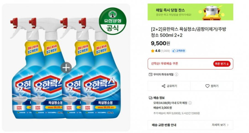 [NS홈쇼핑]유한락스 욕실/곰팡이/주방 청소세제 500ml 4개(9,500원/배송비지원)