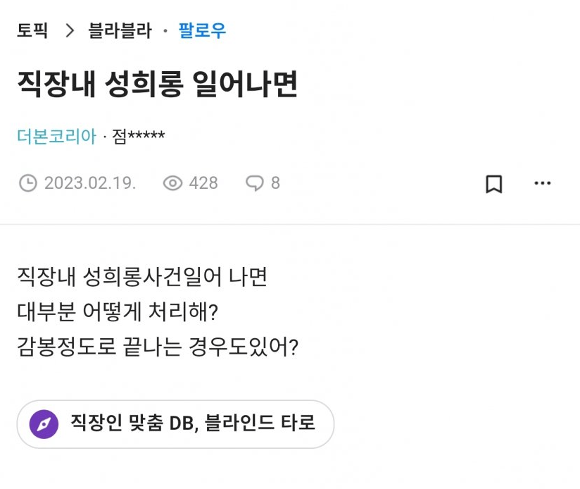 2023년) 더본코리아 블라인드 의미심장한 글.jpg 작성자 정보 헬로우 작성 작성일 2025.04.08 00:35 컨텐츠 정보 427 조회 목록 본문 관련자료 이전 고소 위기에 놓인 ChatGPT 작성일 2025.04.08 18:00 다음 배우 김지은이 단발 시절 학생들에게 자주 들었다는 말.JPG 작성일 2025.04.08 00:34 댓글 0 등록된 댓글이 없습니다. 로그인한 회원만 댓글 등록이 가능합니다. 목록