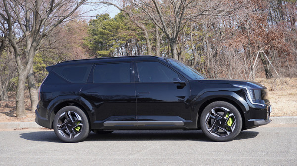 측면에서는 21인치 휠 안쪽에 연두색 브레이크 캘리퍼로 포인트를 주고 있다. 후면에서는 전면과 유기적으로 조화를 이루는 테일램프 덕분에 기아의 아이덴티티가 더욱 두드러진다.