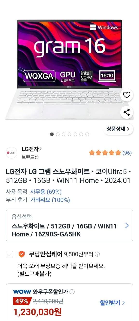 [쿠팡]엘지 그램 16Z90S-GA5HK 울트라5 윈11 (와우 1,230,030원/무료)