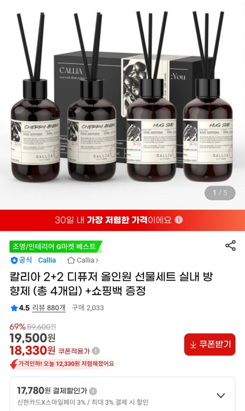 [지마켓]칼리아 디퓨저 2+2+쇼핑백증정 (18,330원/무료)