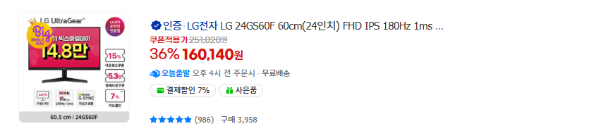 요즘 들어 24인치 고주사율 모니터들이 더 나오면서 예전보다는 인기가 떨어졌지만