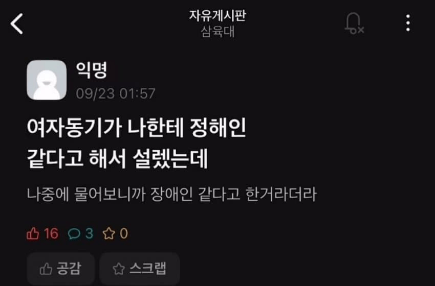 여자 동기가 나한테 정해인 같다고 해서 설렜는데...jpg 작성자 정보 팬더 작성 작성일 2025.03.04 19:50 컨텐츠 정보 413 조회 목록 본문 관련자료 이전 홈플러스가 기업회생 하는 이유 작성일 2025.03.04 19:51 다음 충격적인 "애놓기좋은나라" 작성일 2025.03.04 19:49 댓글 0 등록된 댓글이 없습니다. 로그인한 회원만 댓글 등록이 가능합니다. 목록