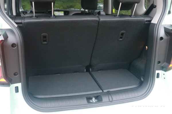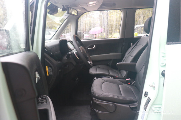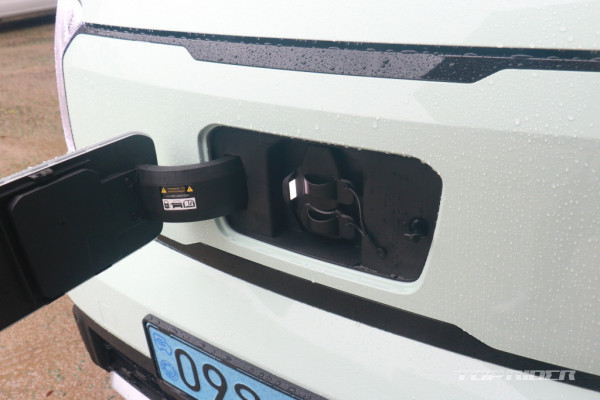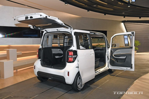 신형 레이 EV 외관은 레이 내연기관과 차이가 없다. 14인치 전용 휠이 탑재된 것과 전면부에 배치된 충전구 정도가 다르다. 조수석쪽 2열 도어만 슬라이딩 방식이다. 신형 레이 EV는 전면부 트렁크 공간이 없다. 대신 PE룸(내연기관 엔진룸)이 있는데, 별다른 커버는 없다.