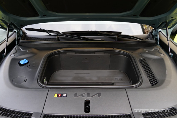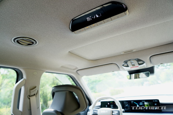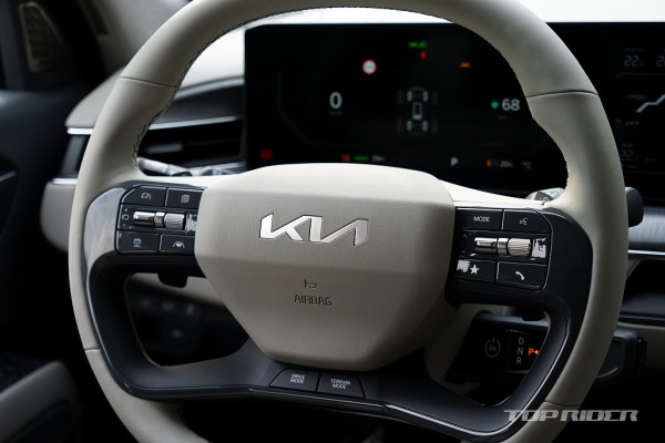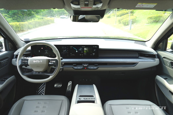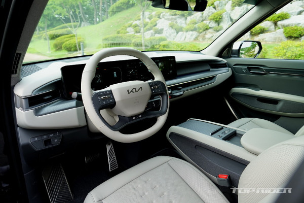 EV9의 시트포지션은 대형 SUV 보다는 다소 낮은 크로스오버와 SUV 사이 수준으로, 넓은 그린하우스를 통해 전방은 물론 측방 시야가 좋다. 편평한 보닛으로 인해 전방 바로 아래, 넓은 전폭으로 인해 우측 사이드미러 부근에 사각이 생기는데, 서라운드 뷰로 해결된다.