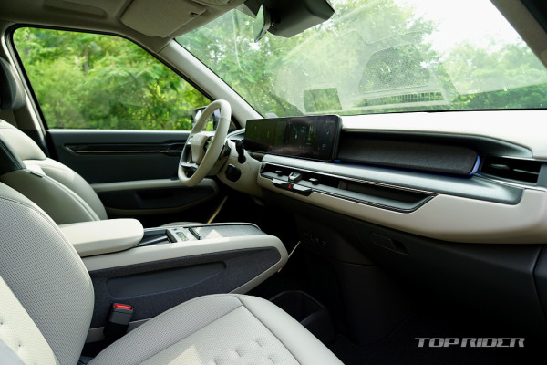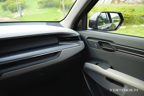 실내는 넓은 공간에 직선 중심의 디자인이 적용돼 쾌적하다. 좌우는 물론 레그룸까지 여유롭다. 전기차의 지속가능성을 강조하기 위해 쓰인 친환경 소재는 고급스럽다고 얘기하기 어렵지만, 부품간 조립 마감이 좋다. 중앙부 우드패널에 스며든 버튼은 조작감이 불분명하다.