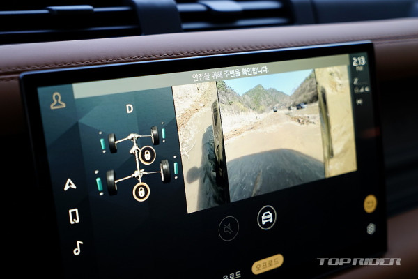 높은 시트에 오르면 넓은 시야가 운전자를 반긴다. 전방은 물론 측방까지 시원한 뷰를 자랑한다. 후방 시야는 스페어 타이어로 인해 다소 제한적인데, 룸미러에는 클리어 뷰라는 후방 카메라 연동 모니터가 제공된다. 승하차시 서스펜션을 낮추는 기능의 활성화가 가능하다.